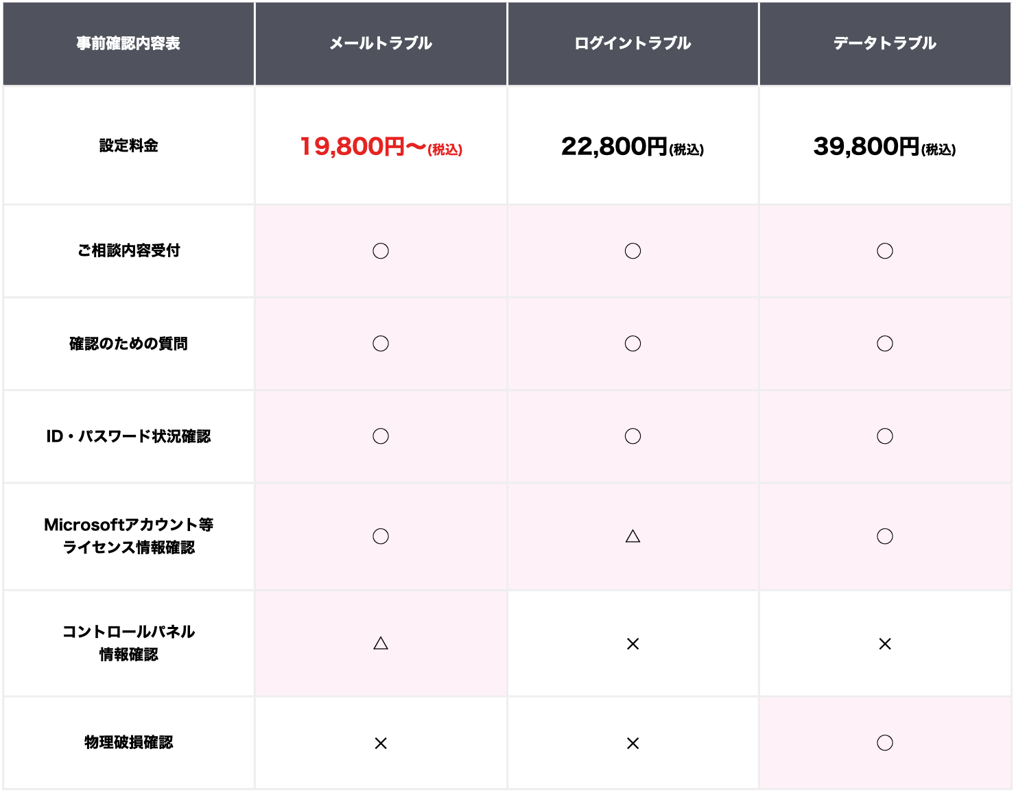 | 事前確認内容表 | メールトラブル | ログイントラブル | データトラブル |